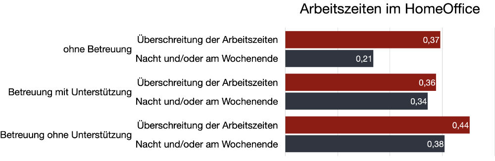 In der Studie fand bei der Betrachtung der Arbeitszeiten im HomeOffice eine Differenzierung dahingehend statt, ob Beschäftigte Zuhause neben der Arbeit auch noch Betreuungsaufgaben, also die Betreuung anderer Personen wie Kindern zu übernehmen hatten.